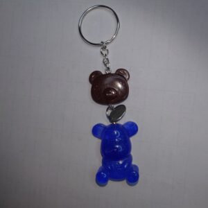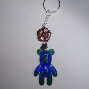 This is a keychain, of a standing Teddy Bear character, in an opaque blue resin with hints of green sparkles and a brown flower decoration, attached on a keychain.