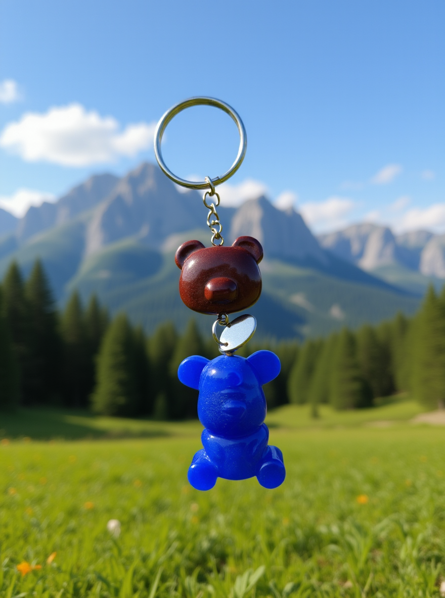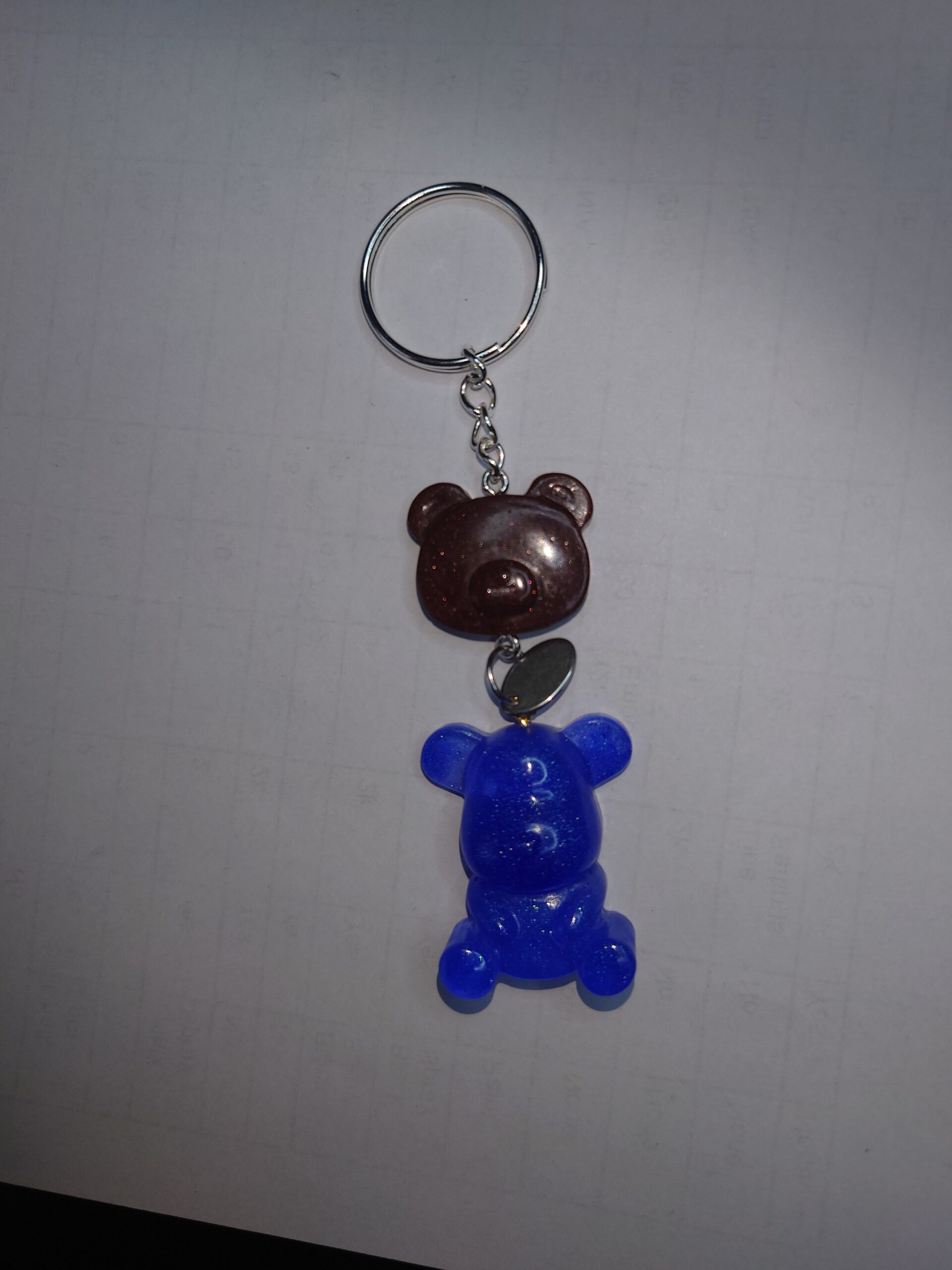 This is a keychain, of a small dog character, in an opaque blue resin with hints of glittering sparkles and a brown resin teddybear charm, attached on a keychain.