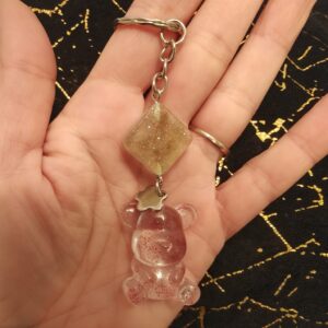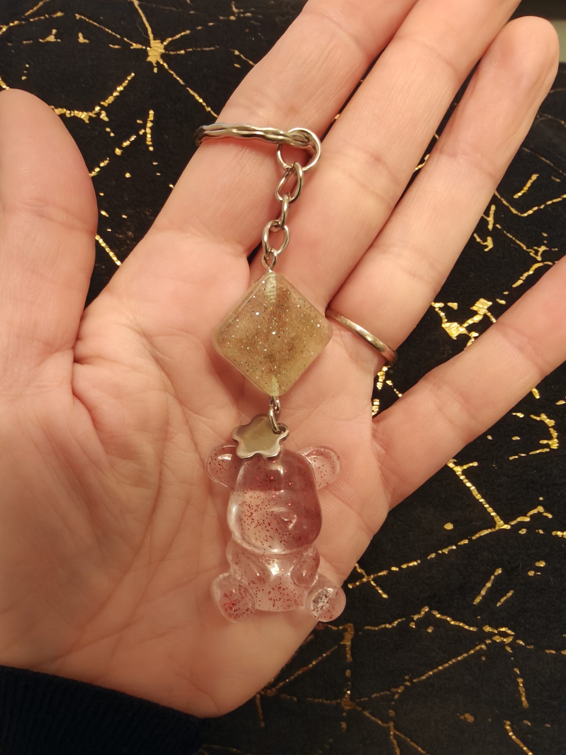 This is a keychain, of a small teddy bear character, in an opaque resin with hints of red sparkles, attached on a keychain.