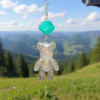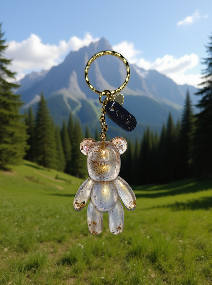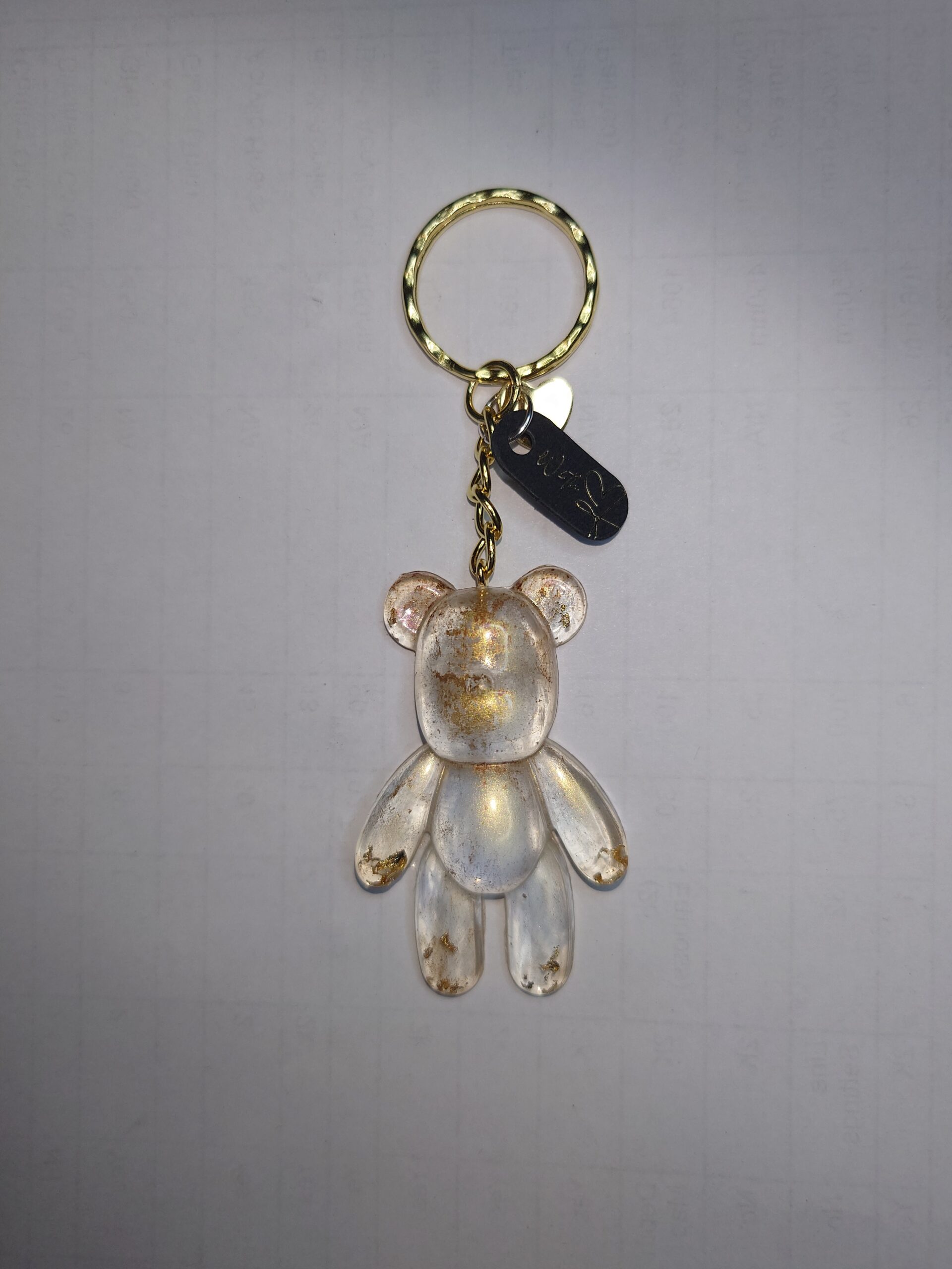 This is a keychain, of a standing TeddyBear character, in a clear resin with hints of gold, depending on how the light hits it, attached on a keychain.